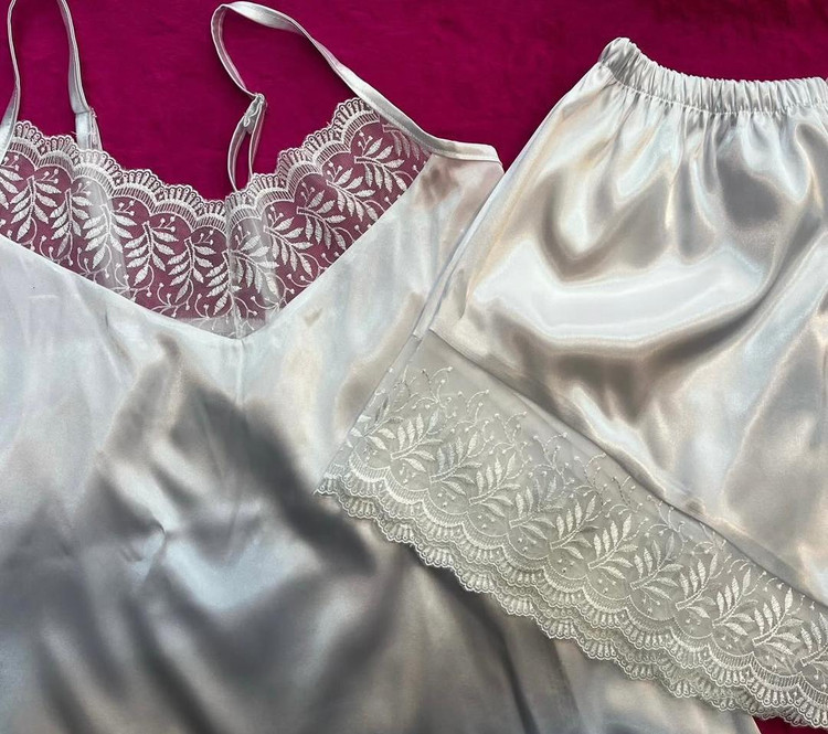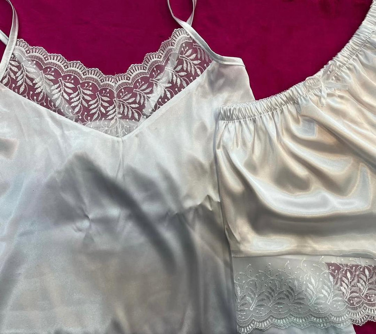 ست تاپ شلوارک ساتن لبه تور دار